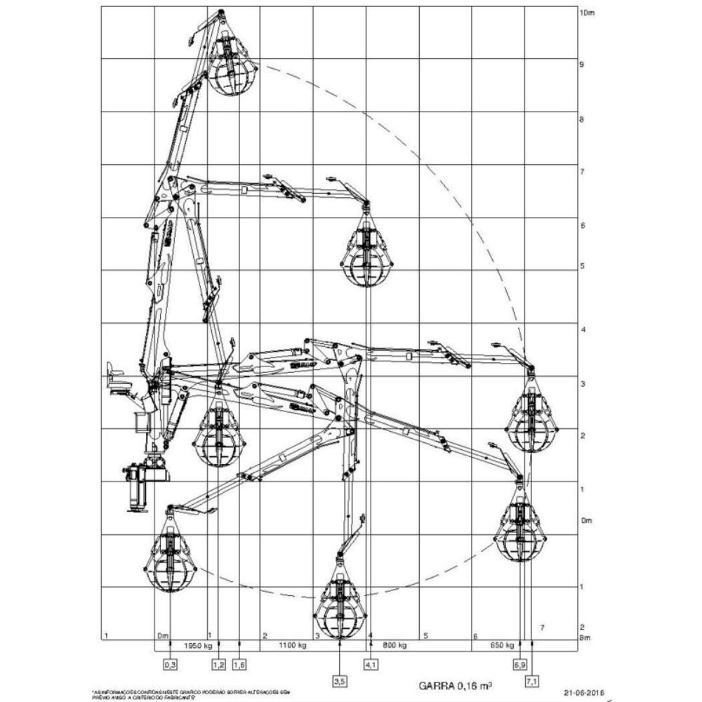 | Capacidade de carga no alcance máximo com garra G-IMS-016 | 650kgf |